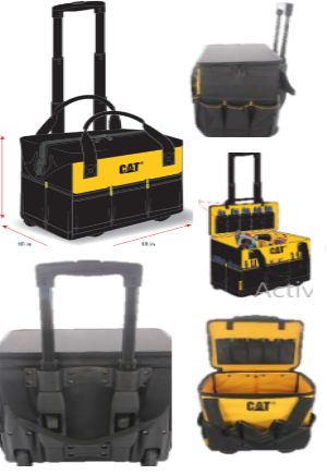 CAT Rolling Tote Bag for Tool Storage, 18 in., 16 pockets, Black and Yellow, 600-D Polyester, Heavy-Duty Trolley and Wheels Made of 600-D material for durability / Lining: 600D Polyester Heat embossed diamond plate pattern 75 lbs. weight capacity supports a wide range of tools and accessories 2 heavy-duty PU wheels enable portability around your job site Access tools and more with ease via the large main compartment Multiple pockets for 8 external pockets and 14 internal pockets The telescoping handle with a comfortable grip makes this bag easy to roll Main zipper compartment and an elastic band to keep the lid open Product dimensions: 18x10x17inch excluding the handle extention This Jobsite rolling tool bag is made with 600-denier polyester material that is tough. The perfect tool bag for saving you the trip when you need your tools. The large main compartments provide abundant storage space for tools and compact power equipment. Large main compartments with 14 internal and 8 external pockets for easy tool access and storage. Designed to be adaptable to any job site. Part Number: CAT-84672 Retail Ready with Hang Tags and UPC Codes Price: $89.90ea MSRP: $ 119.00 Quantity: 900 to 1000 pcs READY NOW Email id:Hajisalim@globalplayersintl.com +91 9819246785/Whatsapp Take All FOB USA NYC