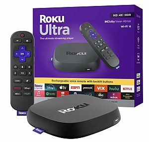Roku Ultra | The Ultimate Streaming Device 4K/HDR/Dolby Vision/Atmos, Rechargeable Roku Voice Remote Pro, Ethernet Port, Hands-Free Controls, Lost Remote Finder, Free & Live TV