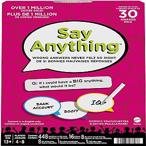 Mattel Games Say Anything Board Game for Teens, Adults & Parties with Question Cards, Dry Erase Scoreboard & More, 4 to 8 Players Ages 13 Years & Older ameplay is easy, breezy fun! Answer conversational questions, The questions are completely open-ended The game is as witty, weird, or wild as the players want it to be! Quantity:800 Cost:$14.00ea Email id:Hajisalim@globalplayersintl.com +91 9819246785/Whatsapp Take All FOB USA NYC