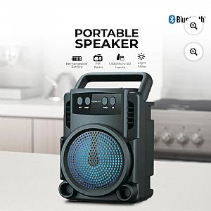 and colorful LED light effects. Compact design with carry handle,